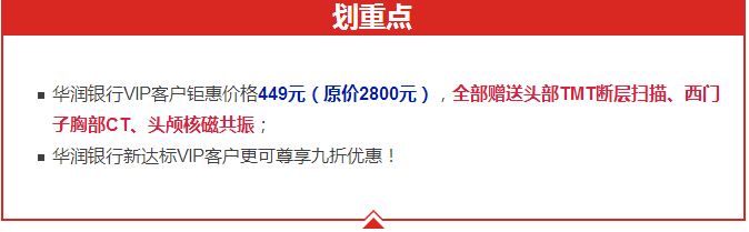 感恩雙親,健康饋贈(zèng)!為答謝華潤(rùn)銀行中山分行VIP客戶,6月15日前憑中山分行VIP卡即可以449元(低至1.6折)尊享原價(jià)2800元美年大健康高端體檢項(xiàng)目,額外饋贈(zèng)頭部TMT斷層掃描、西門子胸部CT、頭顱核磁共振項(xiàng)目;中山分行新VIP客戶更可尊享活動(dòng)價(jià)再9折優(yōu)惠。唯有健康最能回饋父母親的愛,請(qǐng)趕緊到華潤(rùn)銀行中山分行報(bào)名參加吧!